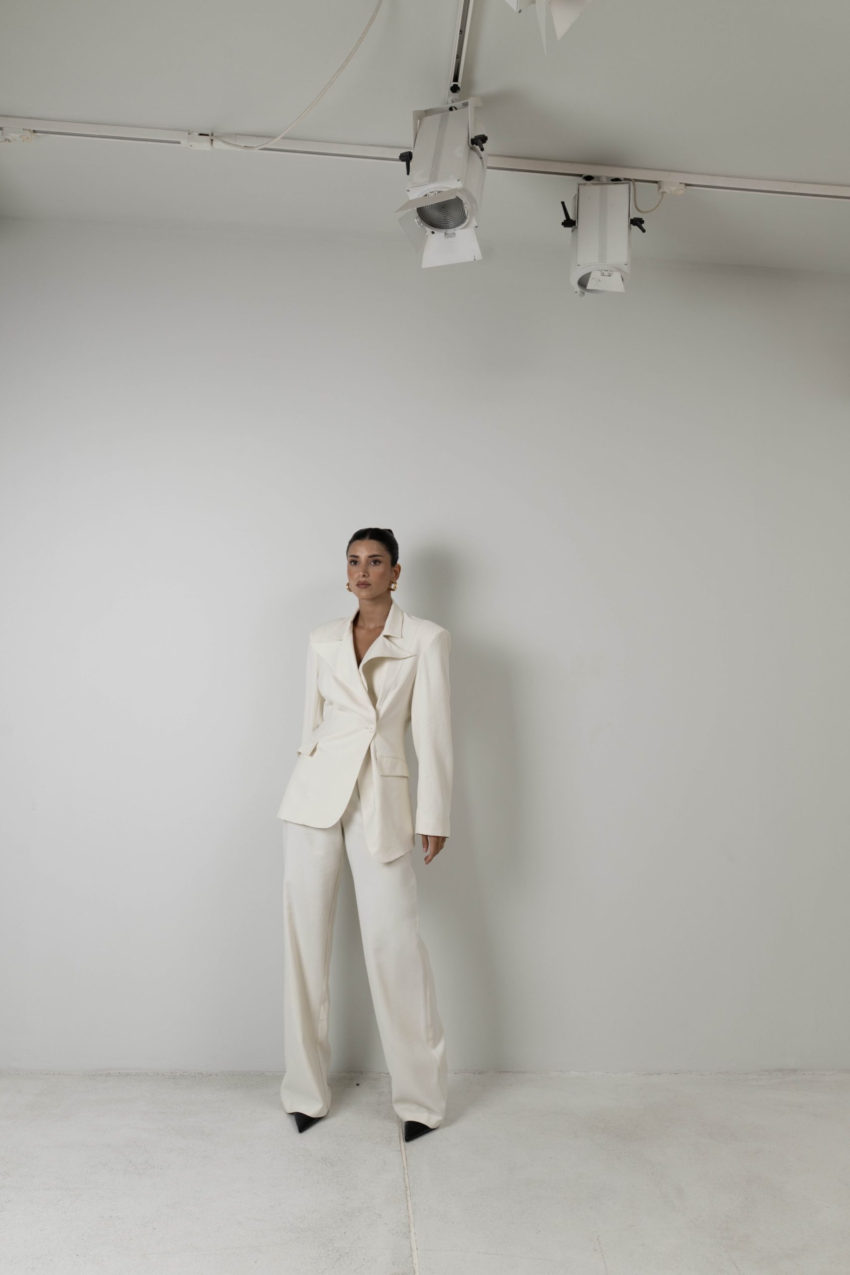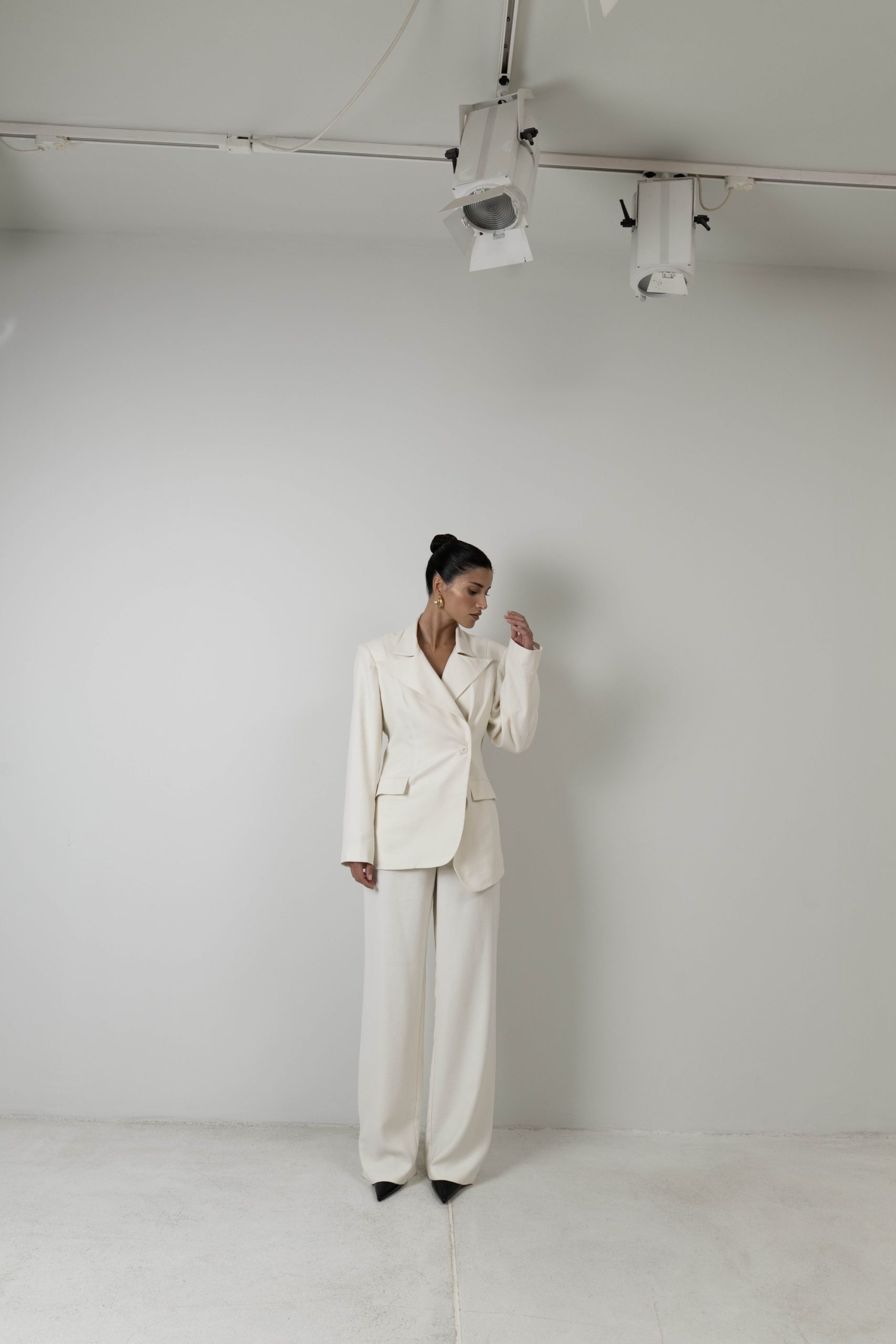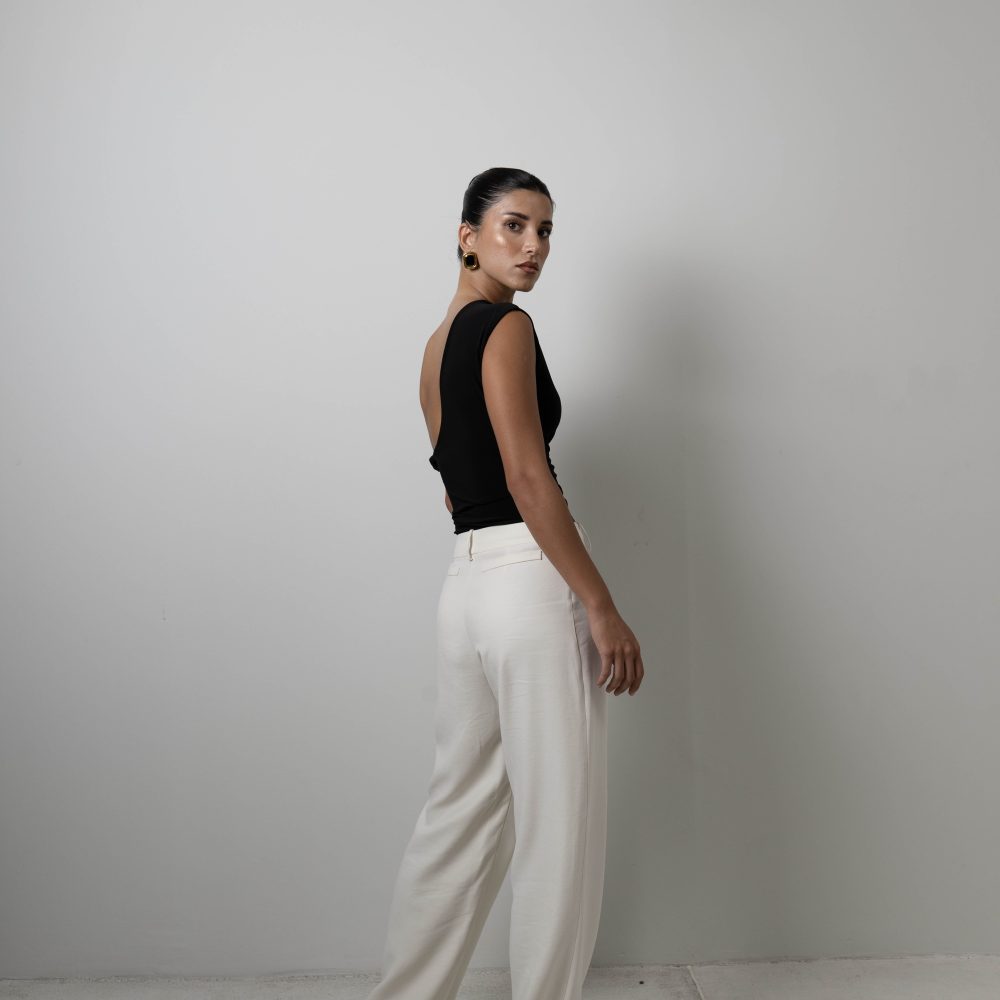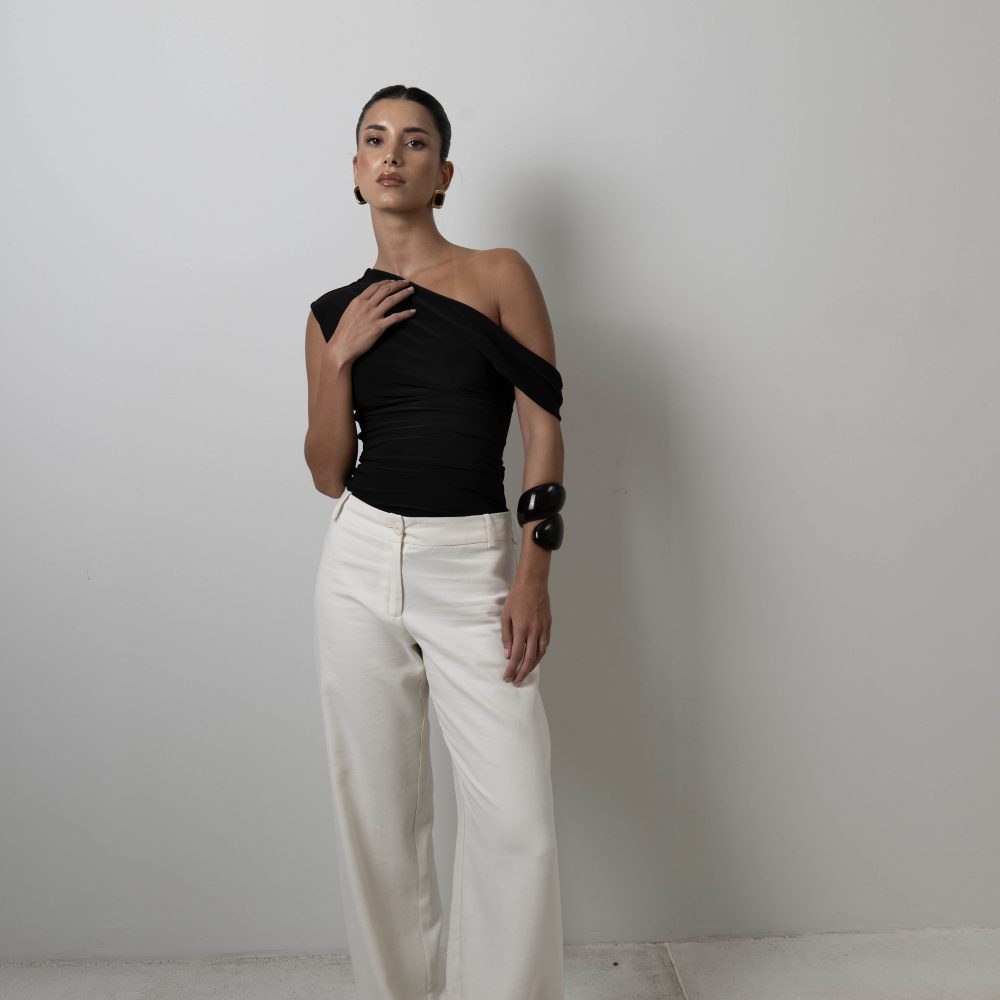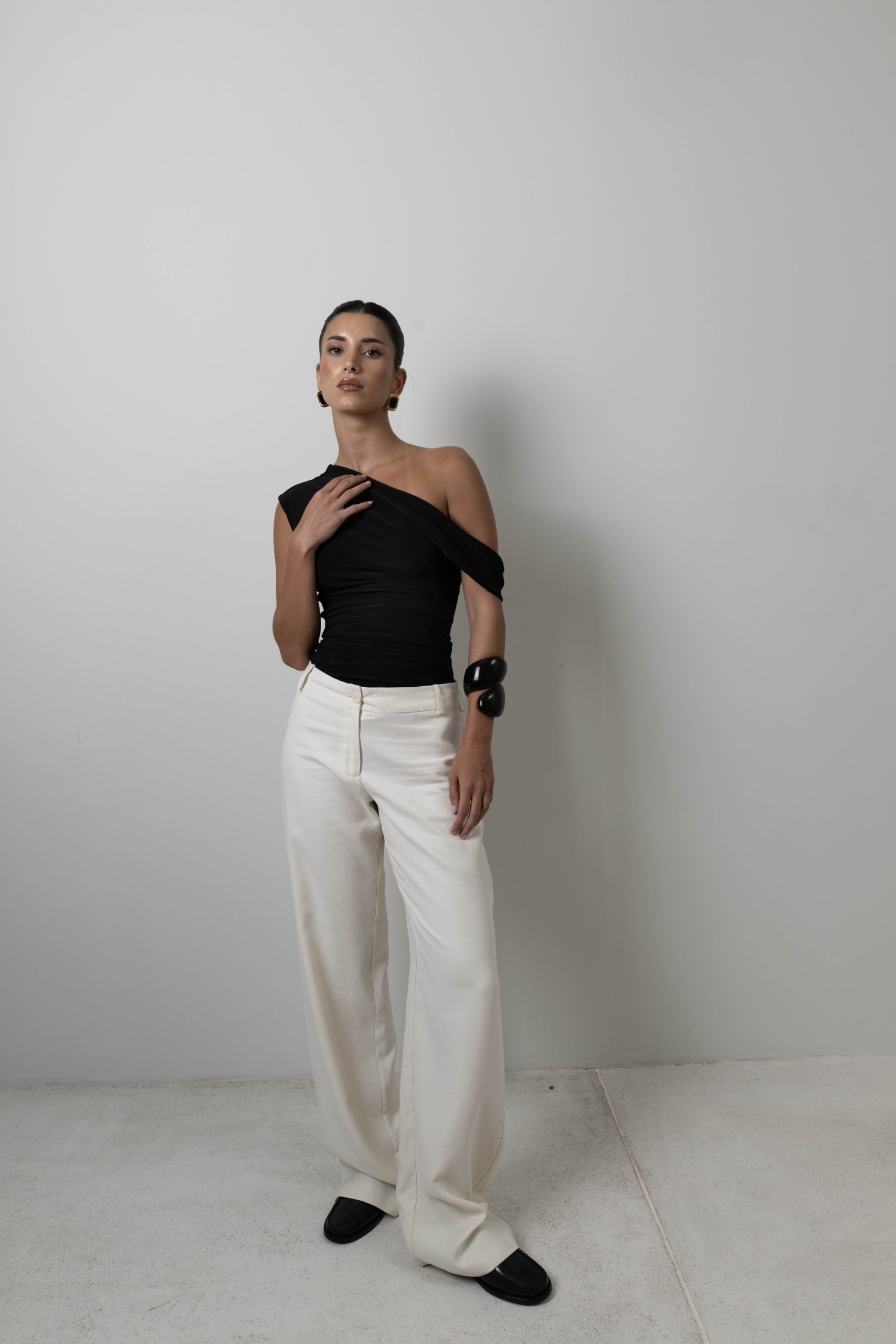 Παντελόνι από ανάλαφρο ύφασμα με ψηλόμεση εφαρμογή και φαρδιά γραμμή.