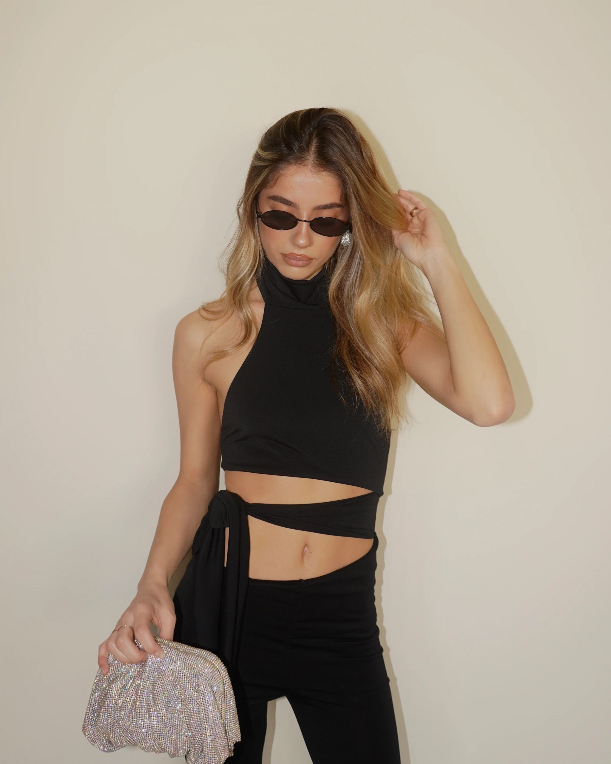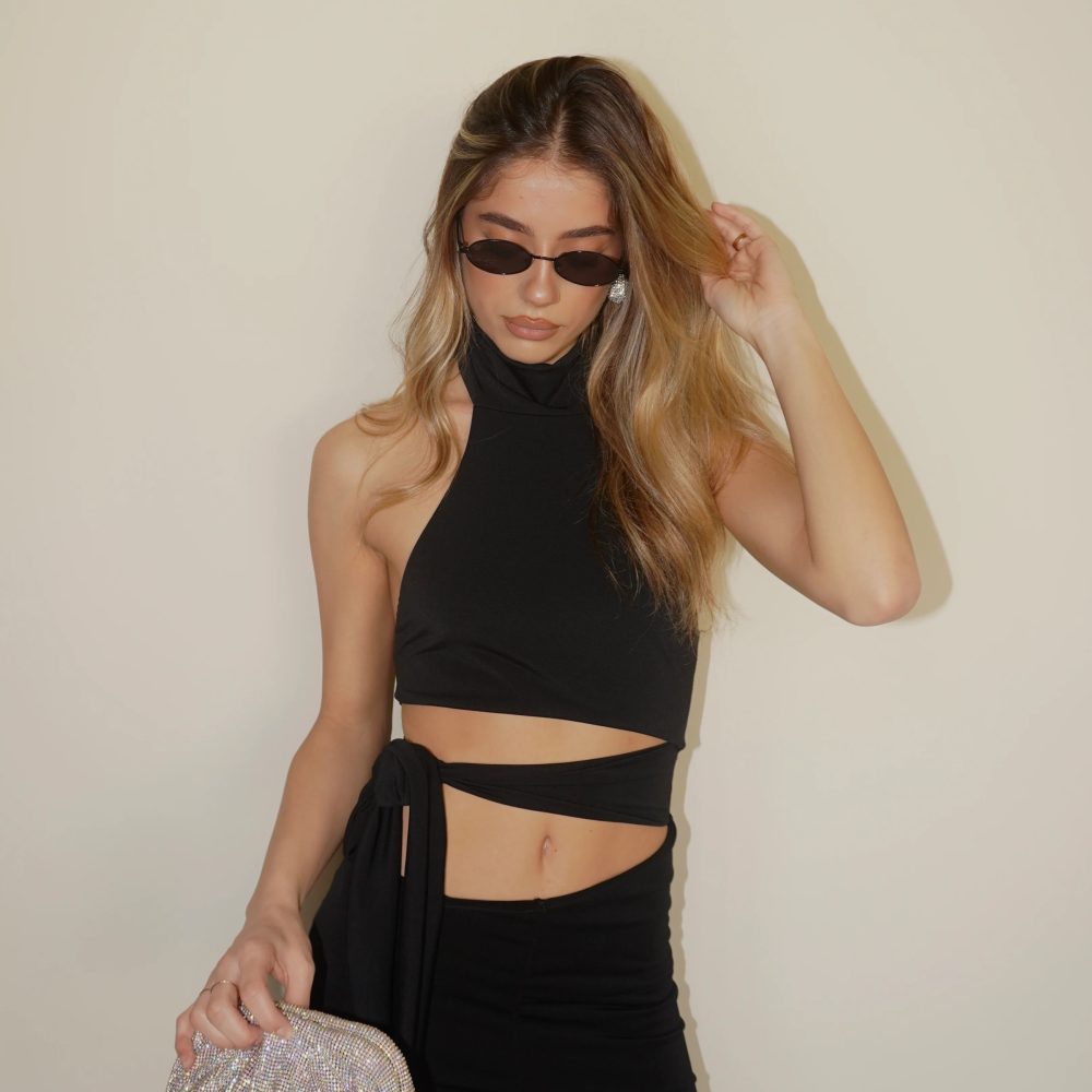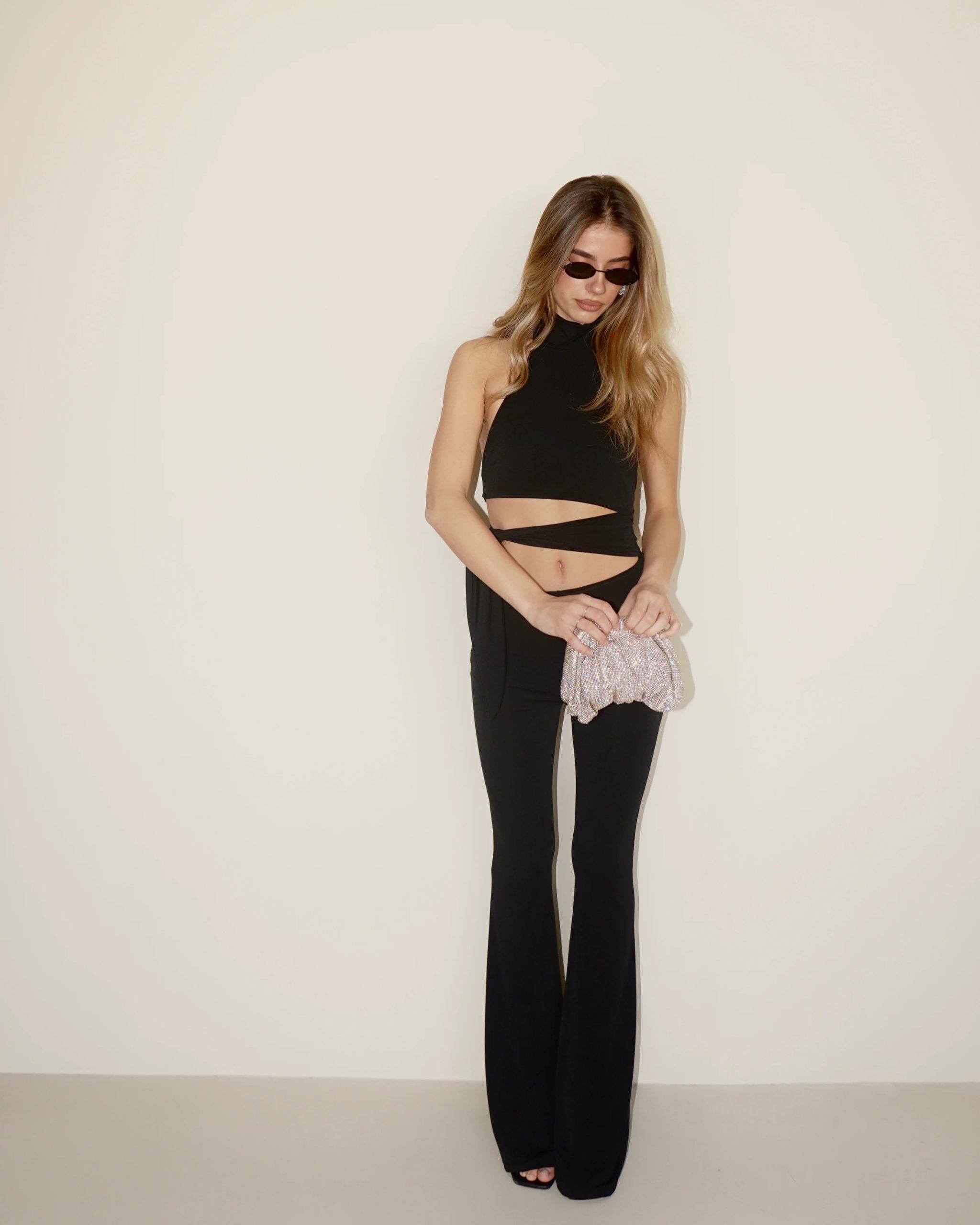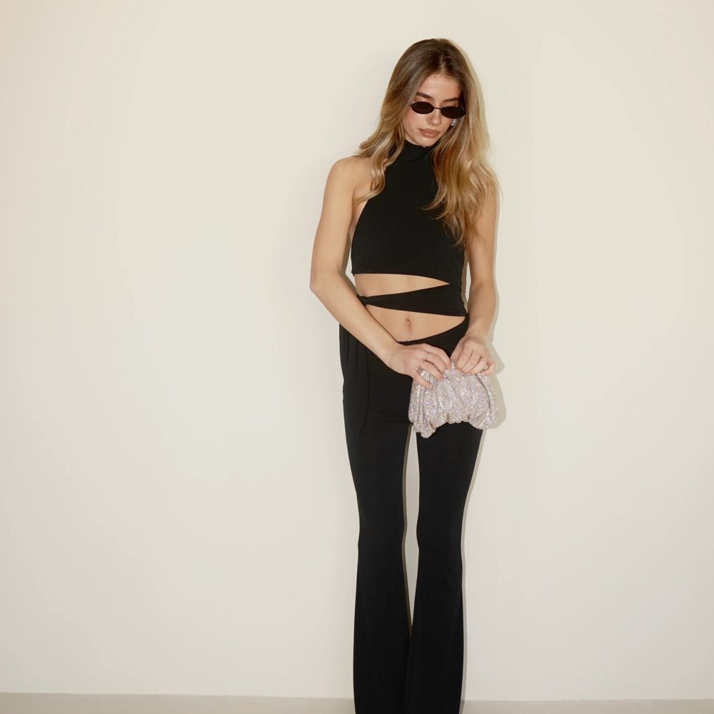 Ολόσωμη φόρμα με μοντέρνο cut-out στη μέση και halter λαιμόκοψη. Αγκαλιάζει το σώμα και αναδεικνύει τη σιλουέτα, ενώ το καμπάνα τελείωμα δίνει κομψό αποτέλεσμα.