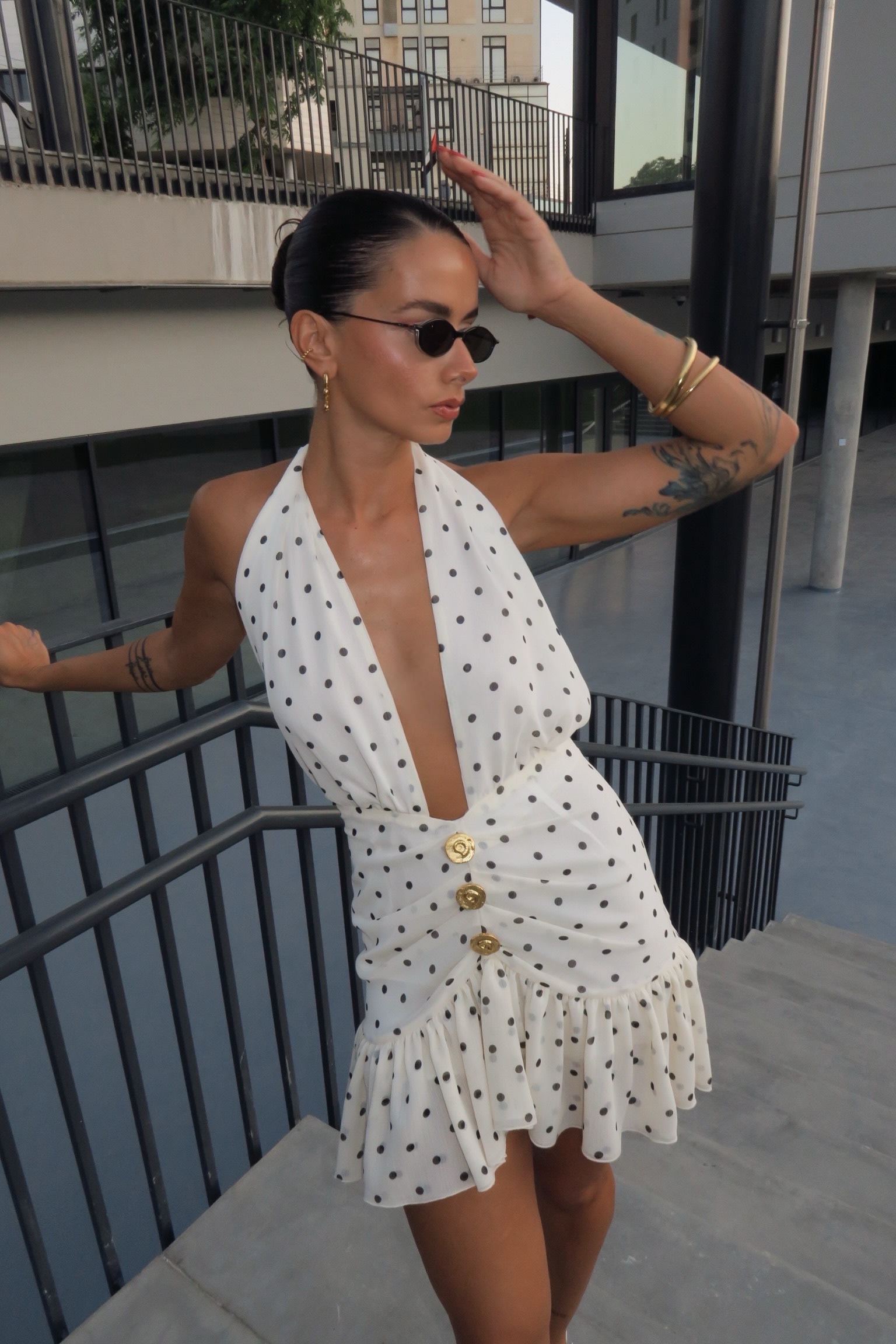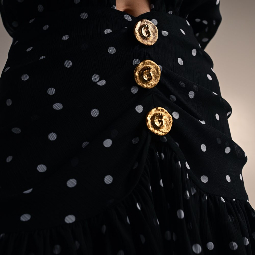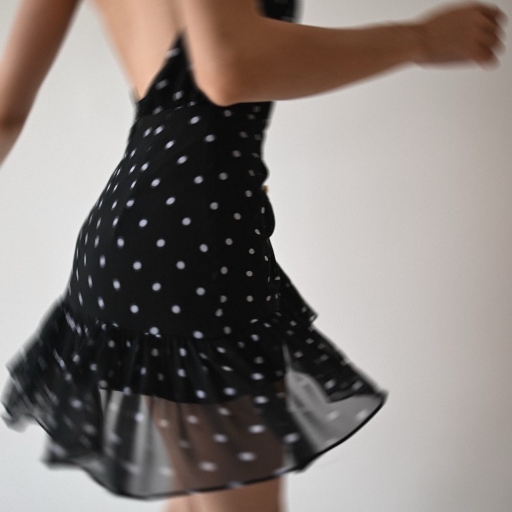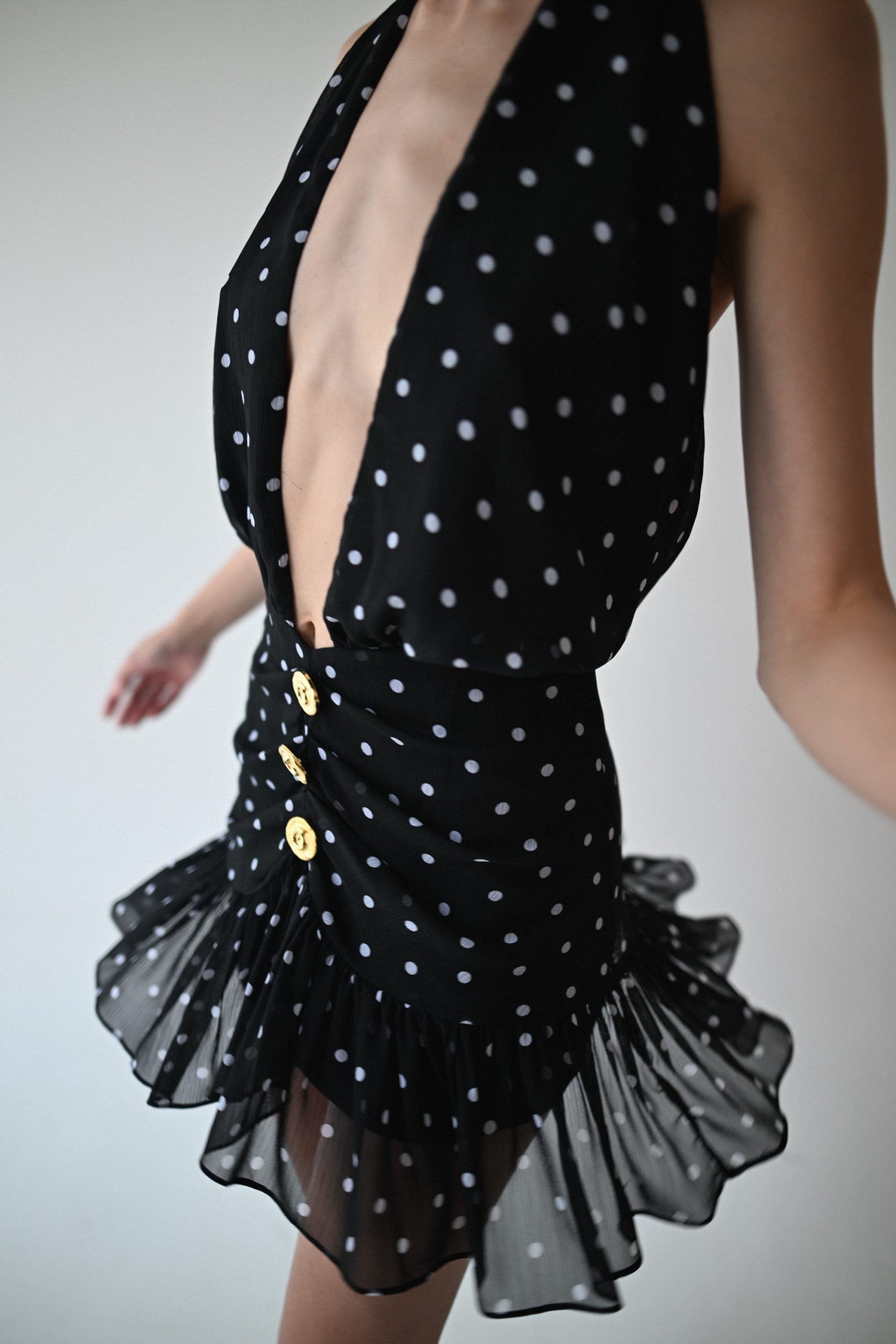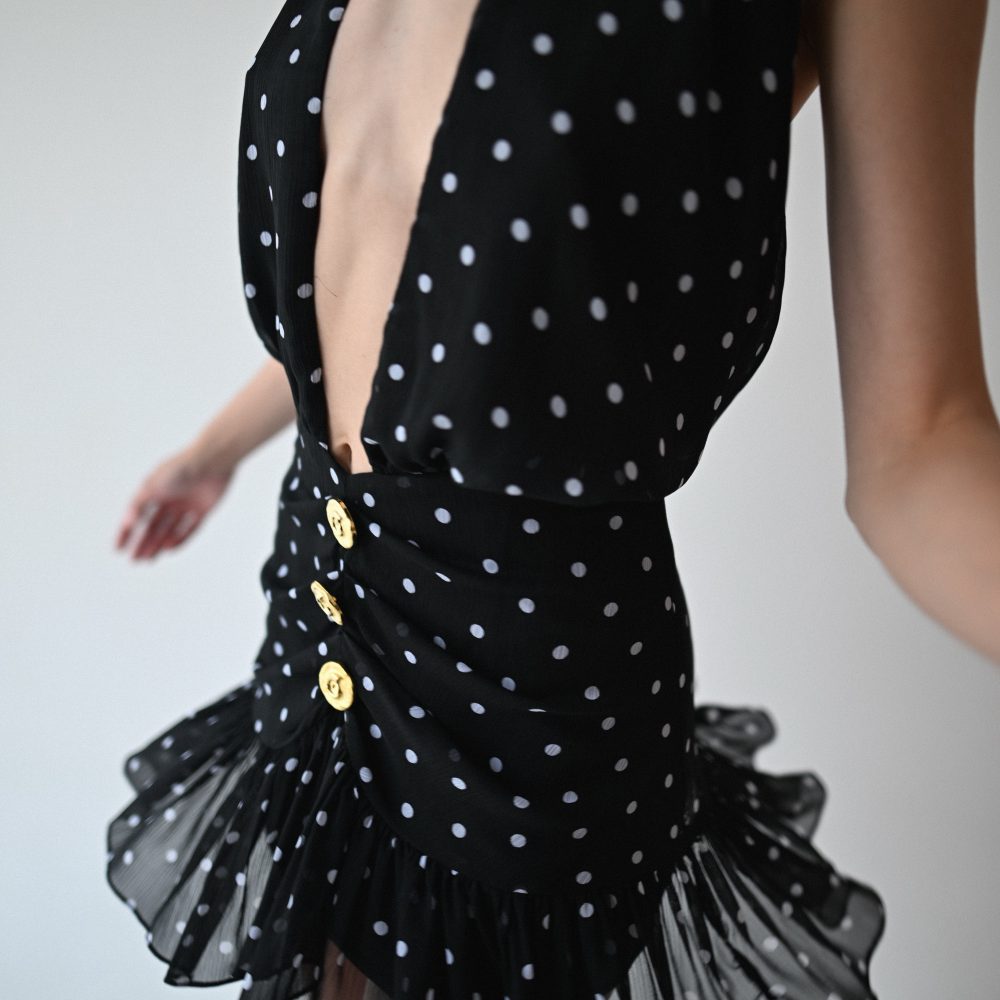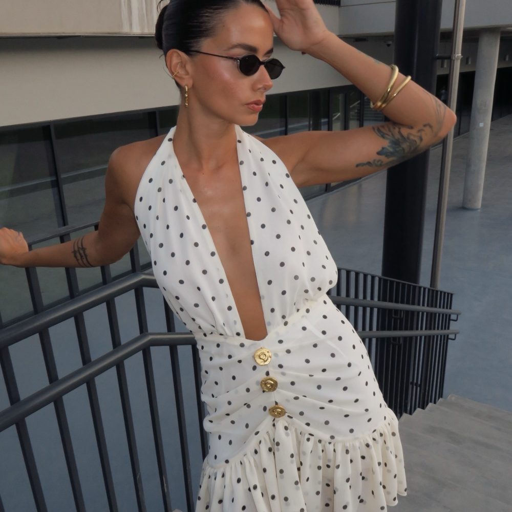 Μίνι φόρεμα με ανοιχτή πλάτη. Δένει στο λαιμό και κλείνει με φερμουάρ πίσω. Διαθέτει βολάν κ χρυσά κουμπιά μπροστά.