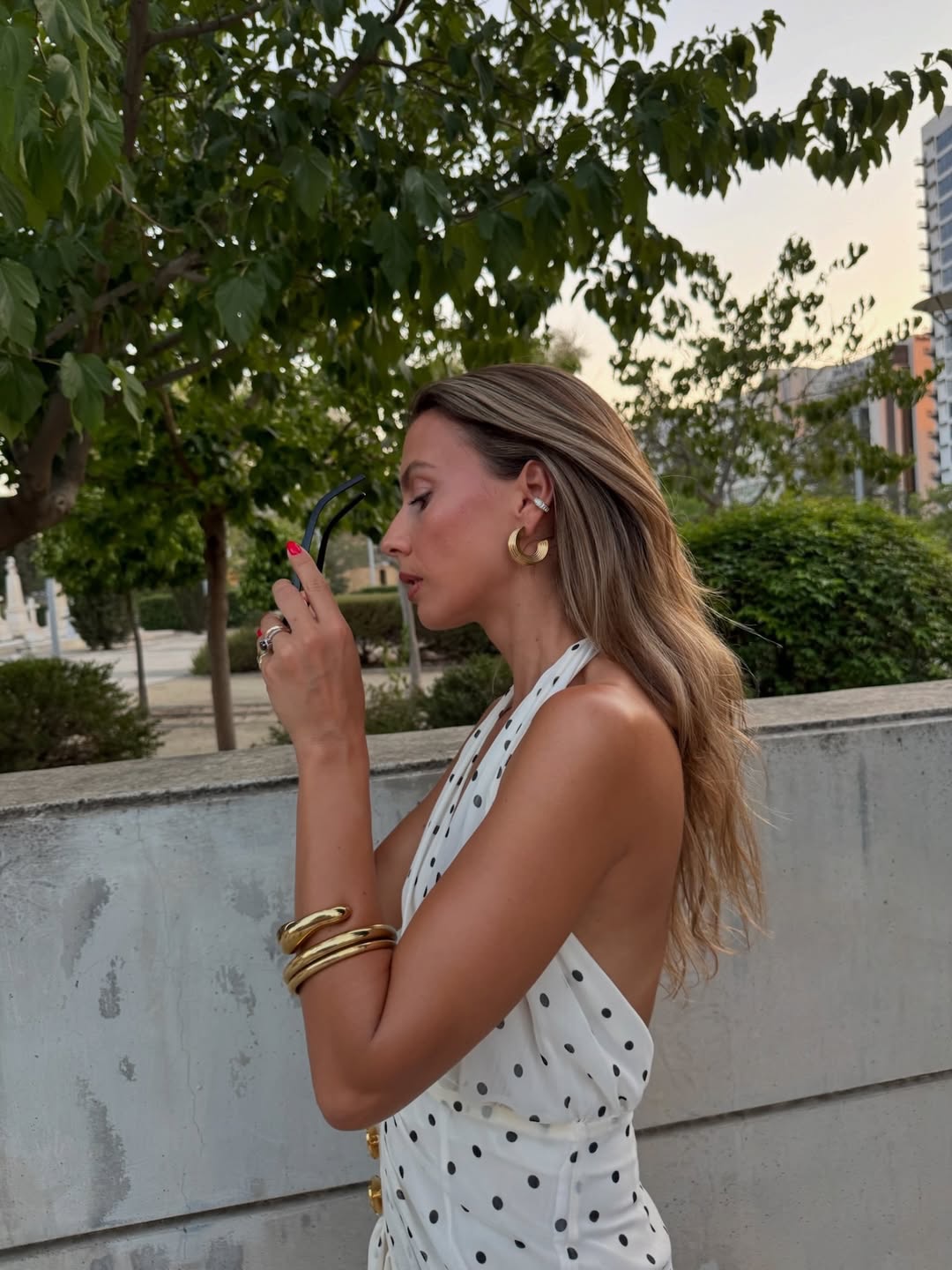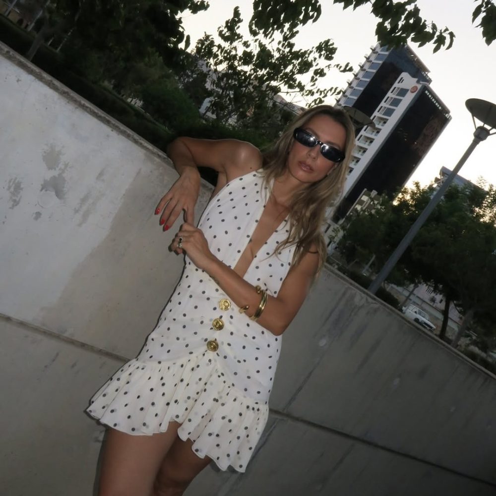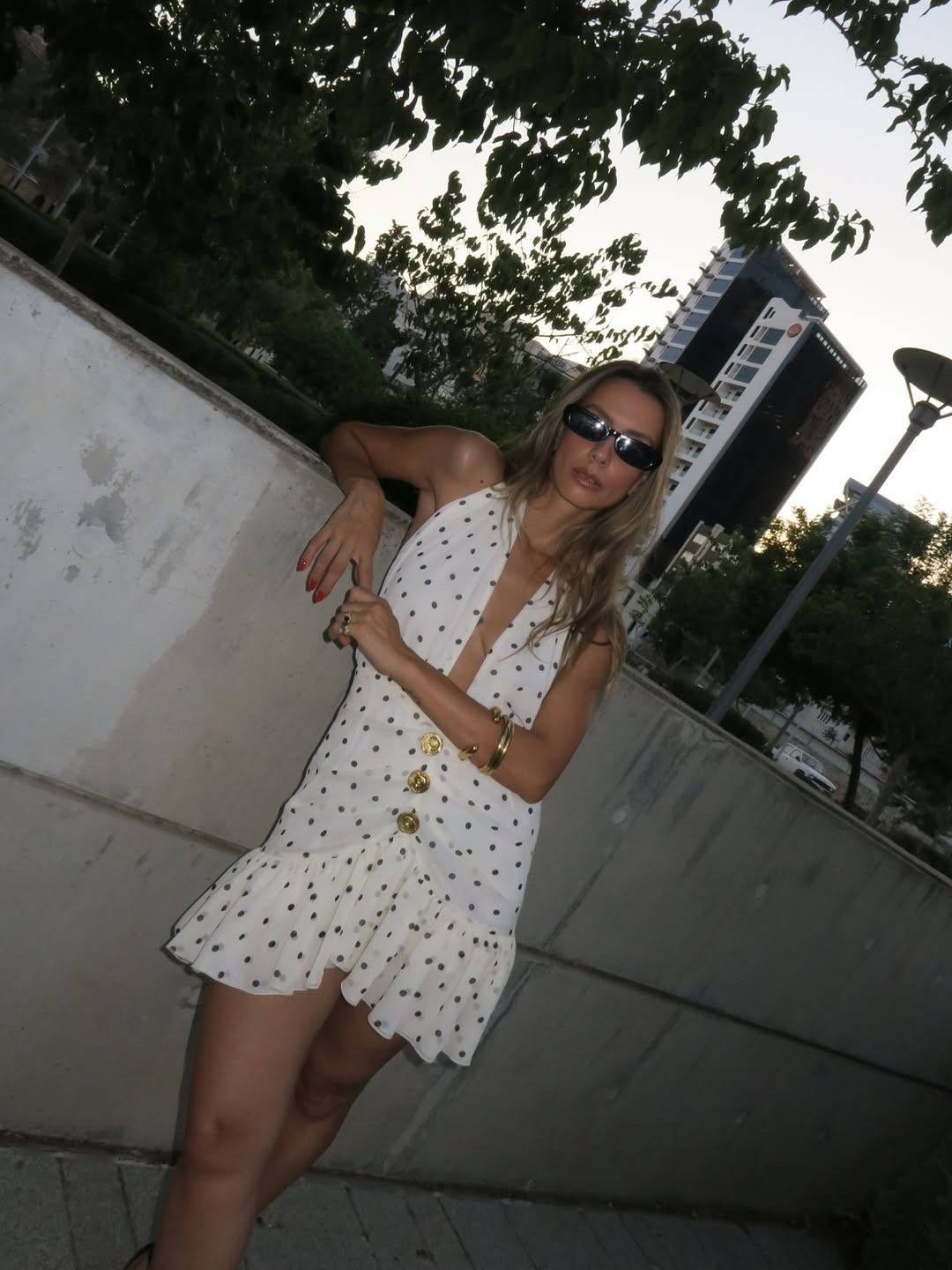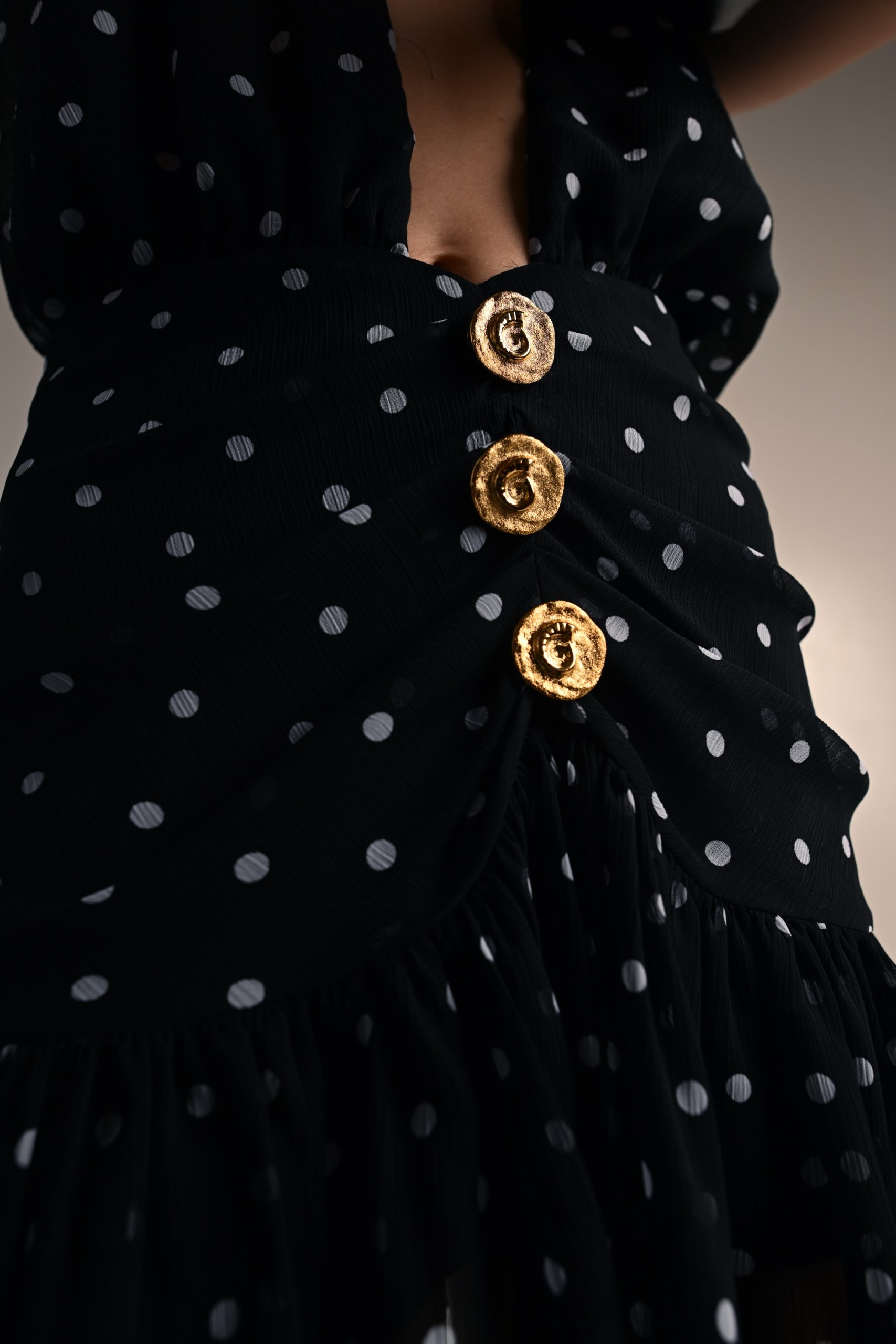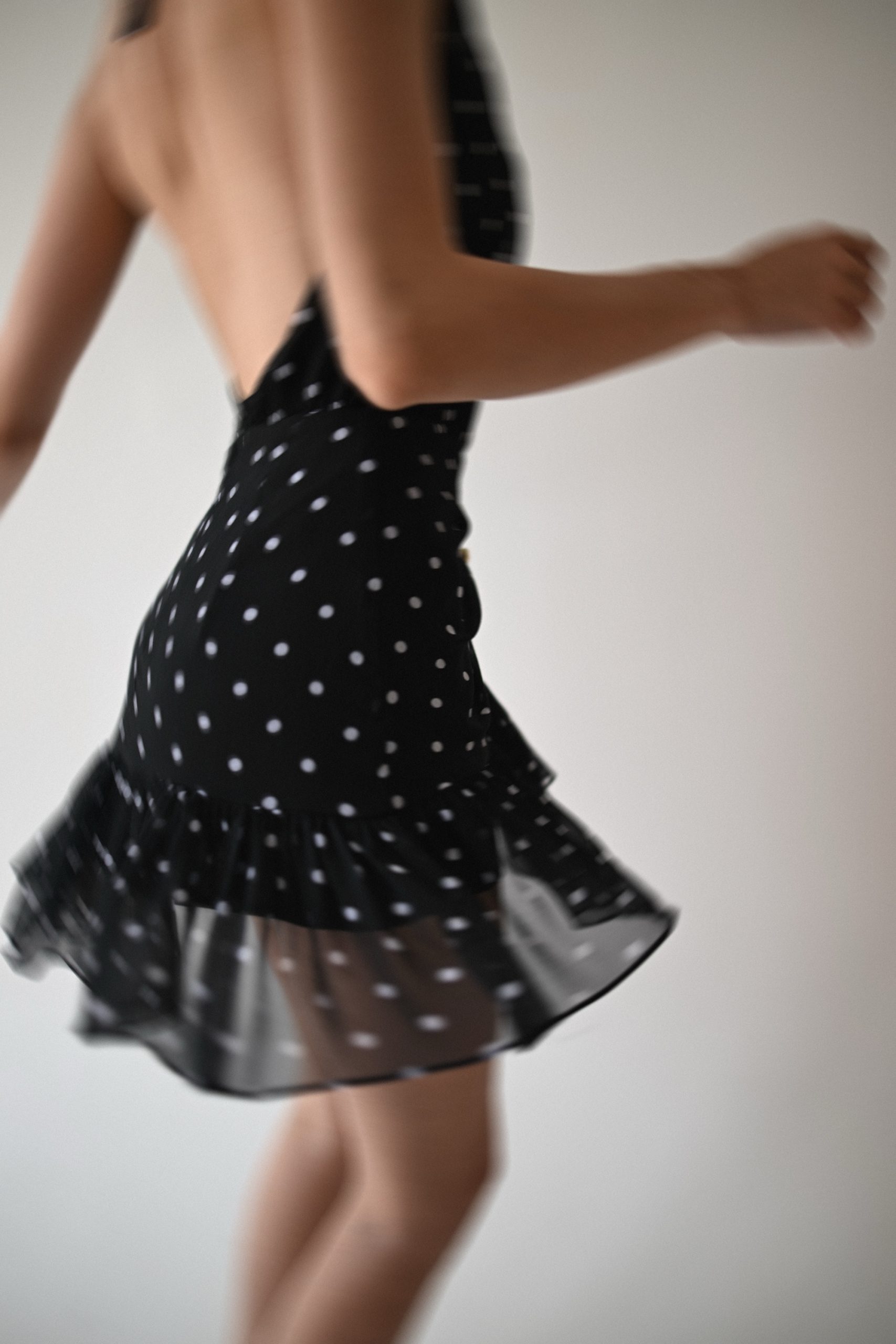 Μίνι φόρεμα με ανοιχτή πλάτη. Δένει στο λαιμό και κλείνει με φερμουάρ πίσω. Διαθέτει βολάν κ χρυσά κουμπιά μπροστά.